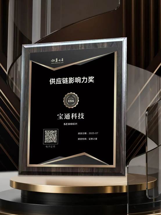7月25日,在“2025证券之星ESG年度论坛暨第三届ESG新标杆企业奖评选”活动中,宝通科技荣获“供应链影响力奖”。该奖项聚焦企业在价值链端可持续管理的系统能力,评选维度涵盖绿色采购、责任协同、供应链监督等方面。此次获奖,是对宝通科技在推动责任采购和绿色供应链建设方面所取得成效的充分肯定。