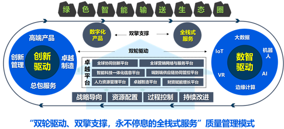 它以数字化产品全栈式服务为两大支撑引擎,直接服务于绿色智能输送生态圈的构建;以创新驱动数智驱动为核心双轮,为产品与服务注入持续领先的差异化优势与高可靠保障;并以追求高可靠、零缺陷的卓越绩效为基石,依托七位一体的组织平台确保战略高效落地与持续进化。这一模式不仅具备前瞻性与系统性,更具突出的可复制性与有效性,已在多家子公司及合作项目中成功实践,助力公司实现从战略到运营的全方位质量引领,成为驱动公司可持续经营与行业进步的核心框架。此次获奖,正是对这套以经营质量为最终标尺的系统性管理模式的权威认可。