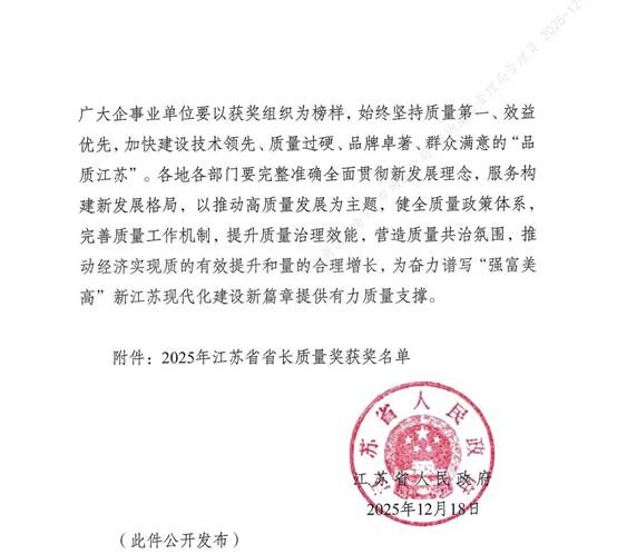 近日,2025年度江苏省省长质量奖获奖名单正式揭晓。宝通凭借卓越的经营质量、系统性的创新驱动及显著的综合绩效,成功摘得这一全省质量领域的最高荣誉。该奖项不仅是对宝通长期秉持高质量发展理念、构建卓越运营体系的权威认可,更标志着公司实现了从质量优势全面经营领先性的标杆跨越。尤为值得瞩目的是,宝通是2025年度无锡市唯一获此殊荣的企业,这一成就不仅是对企业自身质量管理卓越水准的最高褒奖,也为无锡制造树立了鲜明的高质量发展新标杆。